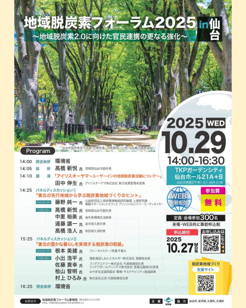 2025年10月29日、環境省が主催する「地域脱炭素フォーラム2025 in 仙台」が開催されます。